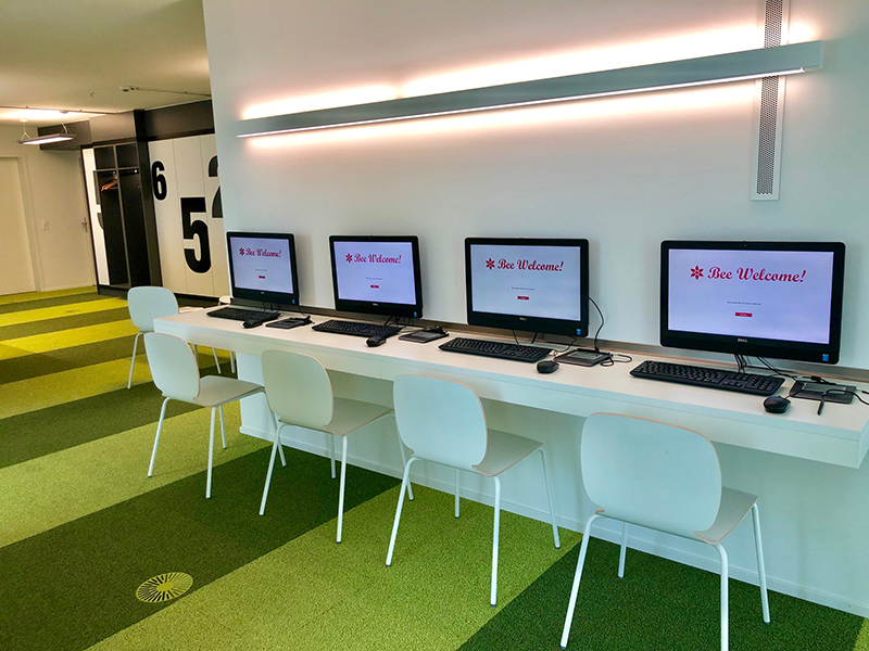 Im Eingangsbereich des neuen Büros finden Kandidatinnen und Kandidaten mehrere Einzel-Arbeitsplätze mit Computern vor. An diesen Welcome Desks geben Sie Ihre Zustimmung für den Datenschutz, bestätigen Ihre persönlichen Angaben und bereiten sich so bestens auf Ihr Interview vor.