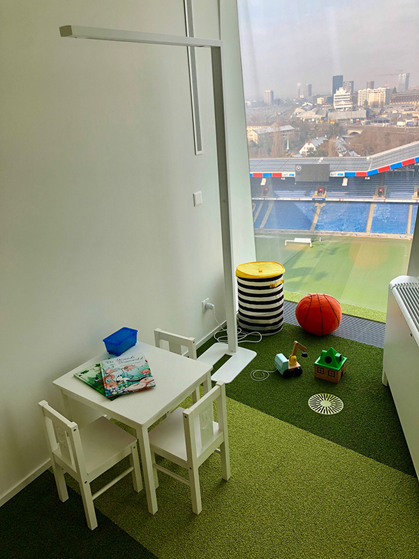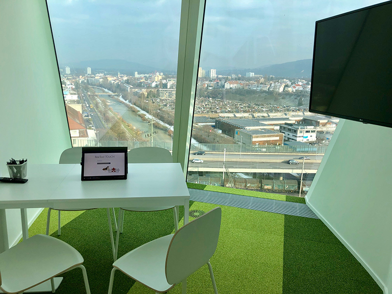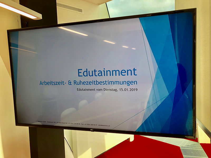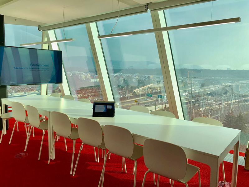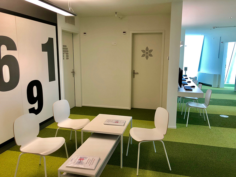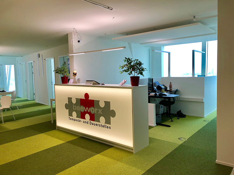 Für die Gespräche mit Bewerberinnen und Bewerbern stehen jetzt insgesamt sieben Besprechungsräume zur Verfügung. Sie sind top-schallisoliert, um ein Höchstmass an Privatsphäre zu gewährleisten. Ausserdem verfügt jedes Zimmer über einen Flatscreen, auf dem wir mögliche Arbeitgeber bereits vorstellen und bei Bedarf eine Einführung in die Sicherheitsregeln oder andere Besonderheiten geben können.